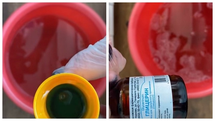 У 7-8 літрів води додайте половину рекомендованої дози будь-якого миючого засобу для підлоги (зазвичай це 1/2 ковпачка). В крайньому випадку підійде і засіб для миття посуду. А тепер вилийте в воду 25-грамовий флакончик звичайного гліцерину. Всі інгредієнти перемішайте і вимийте підлогу.