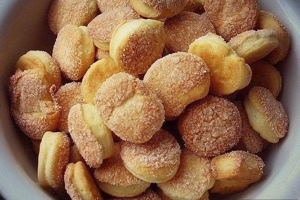 Усе змішати, замісити нетуге тісто, розкочувати завтовшки 0,5 см, випекти печиво. Гарячим обкачати в цукровій пудрі. А можна сформоване печиво змастити білком і посипати цукром.
