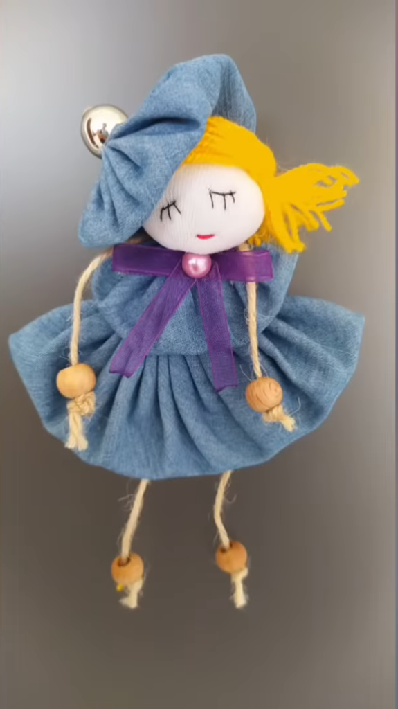 Лялечка готова. Залишилося придумати де саме її розмістити. Подивитись де доведеться доповнити петлю. Змусити ляльку сидіти легко, можна вставивши всередину шматок дроту. Дріт ж допоможе зробити руки ляльки основою чарівного держателя для штор.