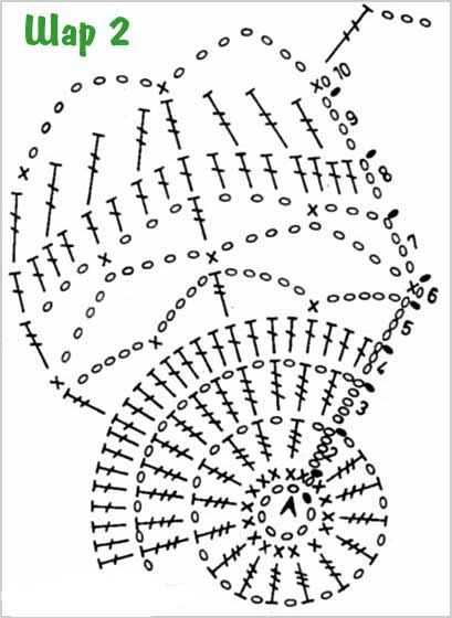 При в’язанні останнього ряду другої половинки з’єднуємо її з першою, при цьому вставивши всередину кулю.