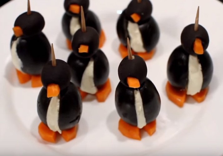 - Для складання одного пінгвіна потрібно: 1 кружок моркви, 1 велика оливка, 1 маленька та 1 зубочистка.