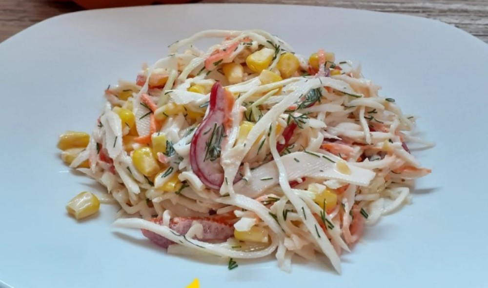 Дуже оригінальний салат, в якому відмінно поєднуються такі продукти, як капуста, крабові палички, кукурудза і солодкий перець. Салат не тільки літній, а й осінній, легкий, смачний, чудово доповнює м’ясні та рибні страви.