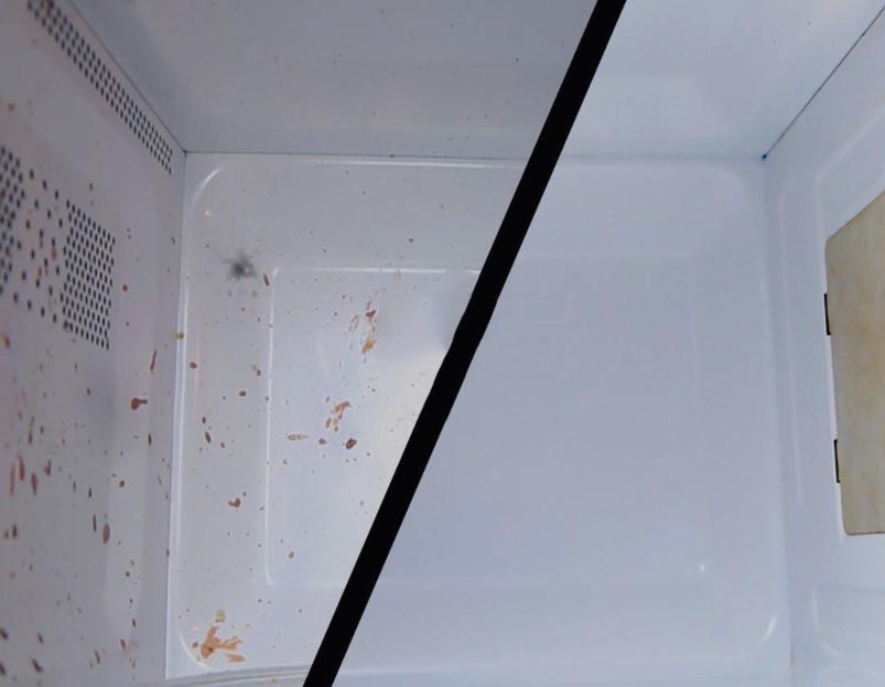 - Поставте миску з 1/2 склянки води і соком + цедрою одного лимона в мікрохвильовку на звичайний режим на 3 хвилини, потім залиште ще на 5 хвилин в закритій мікрохвильовці, після цього просто протріть забруднення чистою губкою