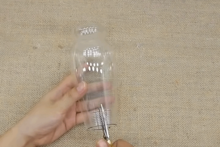 Для нижньої частини сукні ідеально підійде пластикова пляшка грушоподібної форми. Обрізавши вузьку частину горлечка, робимо глибокі поздовжні надрізи, а потім з’єднуємо смуги між собою за допомогою степлера так, щоб діаметр каркаса зменшився до потрібного розміру.