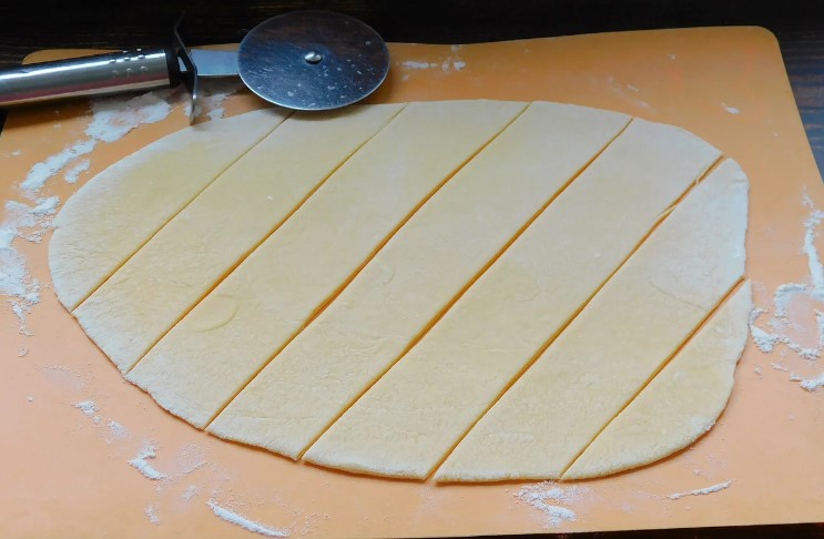 - Відокремити половину і розкачати в якомога тонший пласт, трохи підсипаючи поверхню борошном. Нарізати на смужки завтовшки 3-4 сантиметри.
