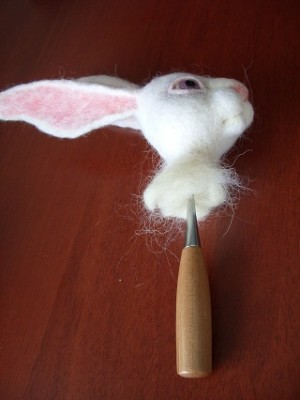 2. Валяння починаємо з голови: намітьте майбутній рельєф мордочки за допомогою сліверу. Залиште спідничку НЕ зваляної вовни на місці шиї.