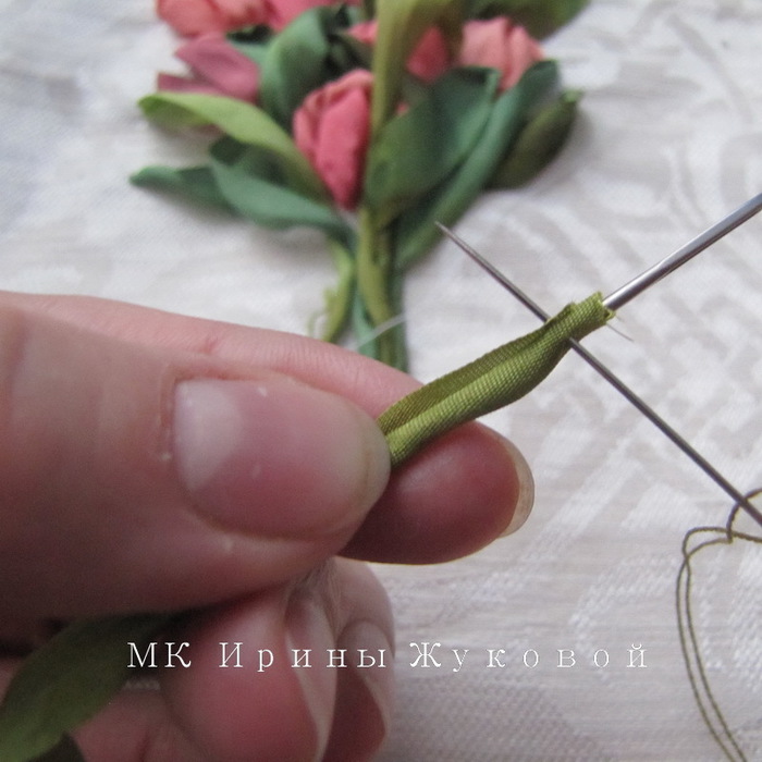 Укладайте листя тюльпанів, як показано на фото досить хаотично, перекриваючи один одного і викладаючи стрічку з вигином, всі отримані складки й вигини прихоплюйте відразу ж потайними стібками ниткою в тон стрічки, стежки можна ховати в складках і вигинах стрічки.