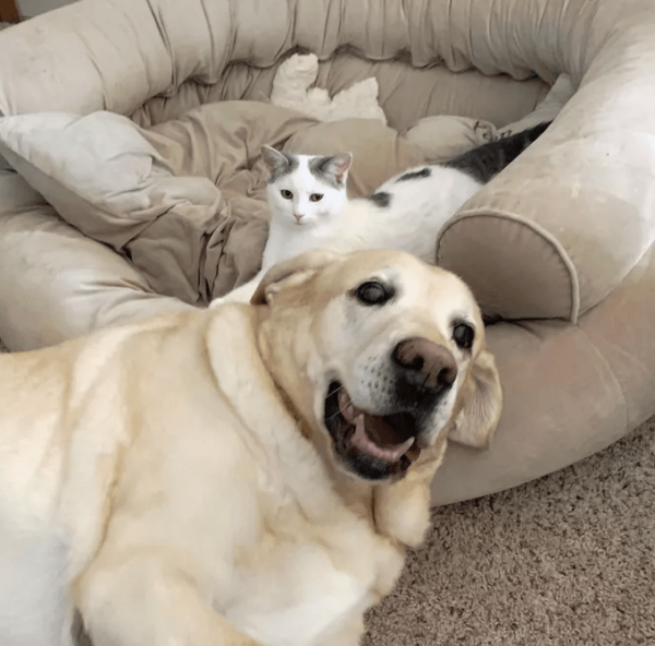 Пекстону майже тринадцять років, а Поллі всього п’ять місяців. Пес вже старий, але дуже терплячий до активного кошеняти. Ці котячі пустощі його ніяк не лякають, і лабрадор з гордістю виконує материнські обов’язки.