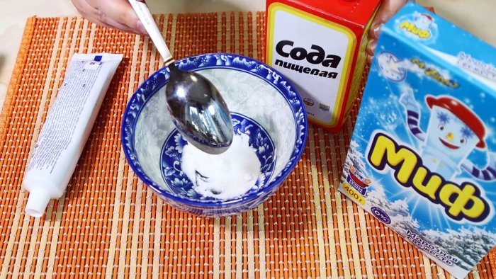 - В окремій місткості потрібно змішати в однакових пропорціях м’ятну зубну пасту, харчову соду і пральний порошок.
