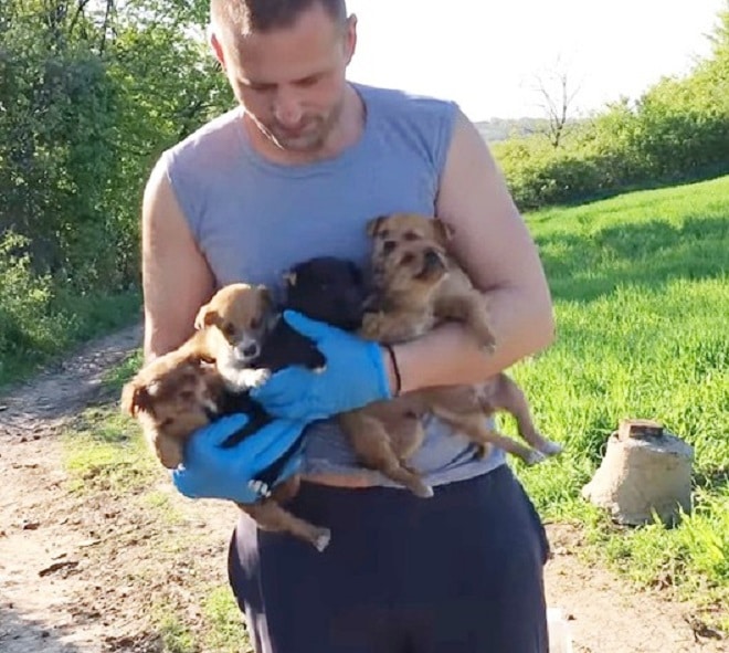 Коли малюки поїли і вгамували спрагу, волонтер акуратно взяв їх в руки і поніс до машини. Виявилося, що всього цуценят п’ять: 4 «дівчинки» і один «хлопчина». Вони спокійно дозволили відвезти себе з лісової галявини, цілком відчуваючи людську доброту.