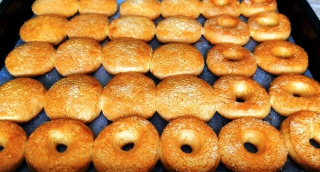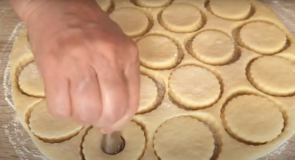 Розкочуємо еластичне тісто в пласт завтовшки 0,5 см. За допомогою склянки ділимо тісто на круги. У частині кіл із тіста робимо отвір всередині.