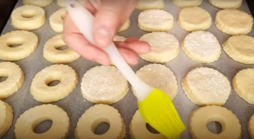 Викладаємо печиво на деко, застелене пергаментом. Змащуємо тісто сумішшю жовтка та молока.
