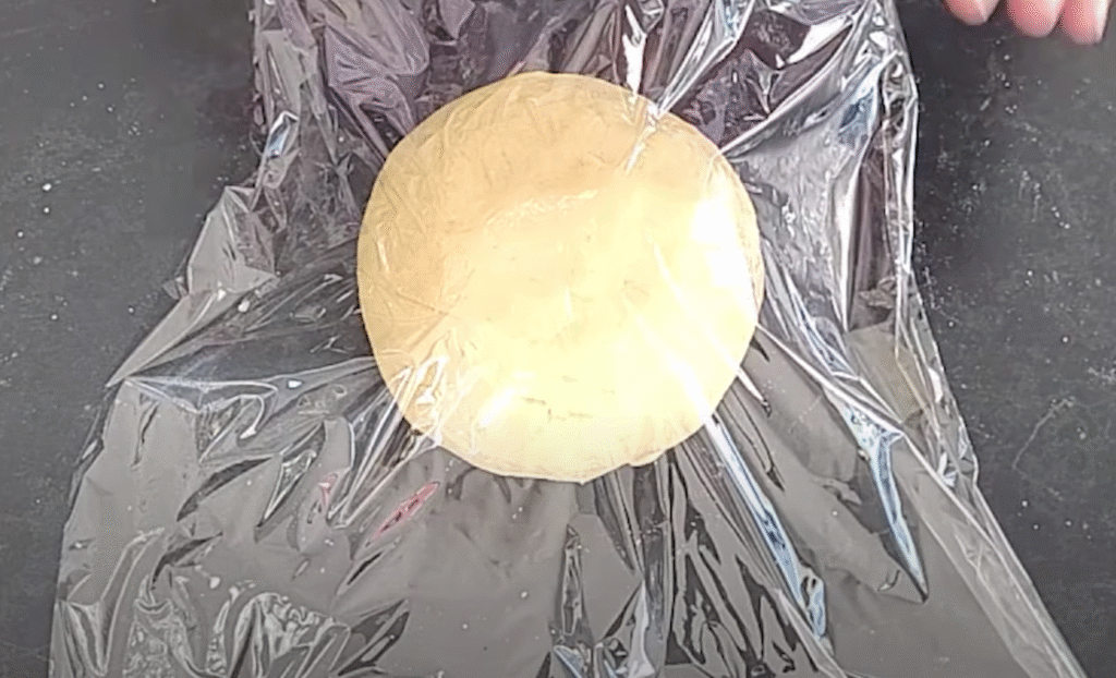 Додати просіяне борошно з розпушувачем і замісити тісто руками. Сформоване тісто загорнути в плівку та покласти в холодильник на 20 хвилин.