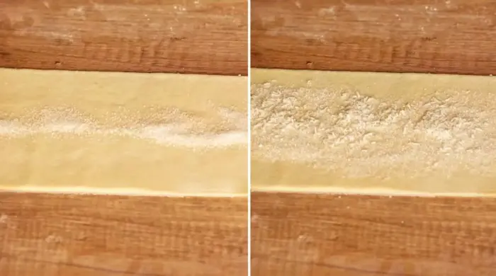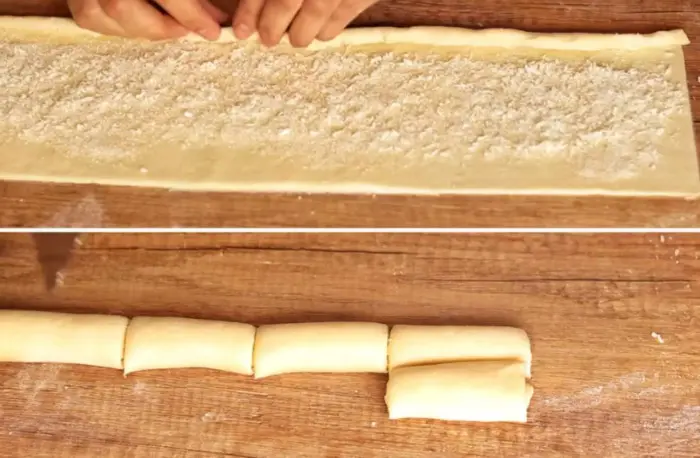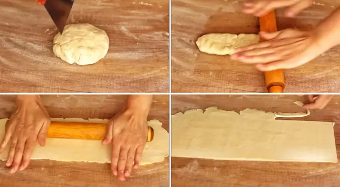 - Розділити тісто на дві частини. З кожної сформувати «ковбаску», а потім розкачати її качалкою до товщини 2-3 мм. Ножем обрізати нерівності – вийде довгий прямокутник.