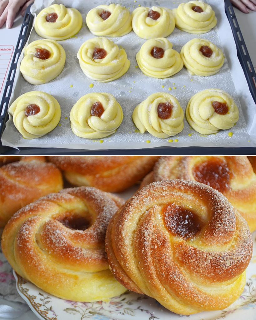Ароматні, ніжні та золотисті — ці булочки з корицею й улюбленим варенням стануть справжньою прикрасою вашого чаювання. Простий рецепт, який завжди виходить!