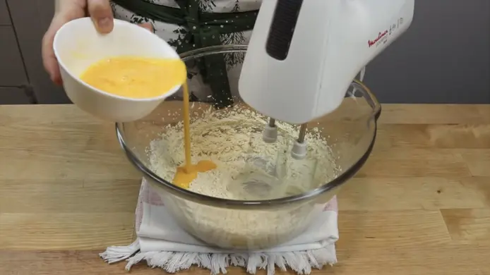 М’яке вершкове масло збиваємо до пишності. Далі, продовжуючи збивати, частинами додаємо цукор, ванільний цукор і сіль.Натираємо цедру одного лимона (можна апельсина), додаємо і перемішуємо.Яйця злегка збиваємо виделкою. Повільно збиваючи масляну масу, поступово вливаємо яєчну суміш.