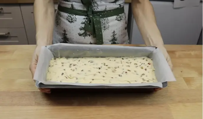 Сухофрукти заздалегідь промити і просушити.Перекладаємо тісто в форму і розрівнюємо лопаткою. Форму застелити пергаментом.
