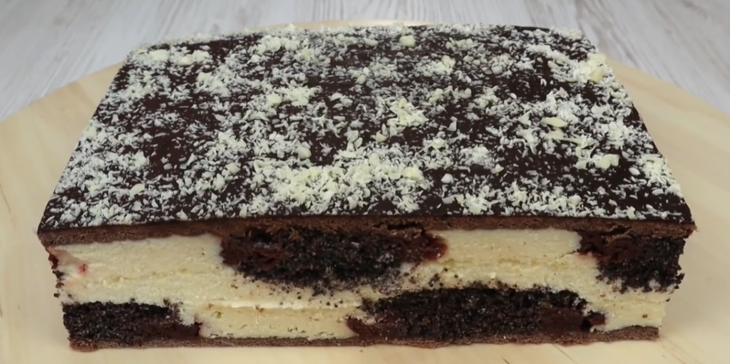 1. Змішати борошно з розпушувачем, какао та цукром. До суміші додати розтоплене масло та сметану, замісити тісто, яке розкачати товщиною 5-7 мм, форма 25×35 см, сформувавши боки коржа висотою 1 см.