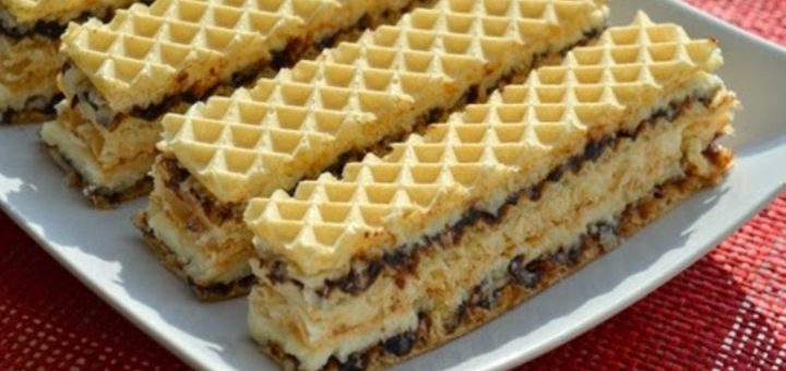 Інгредієнти: 4 вафлі (квадратний торт) 150 г кокосової стружки 0,5 склянки молока 0,5 склянки цукрової пудри 2 кубики вершкового масла (100 г) 1 банку сливового джему Рецепт приготування: Молоко закип’ятити, запарити в ньому кокос....
