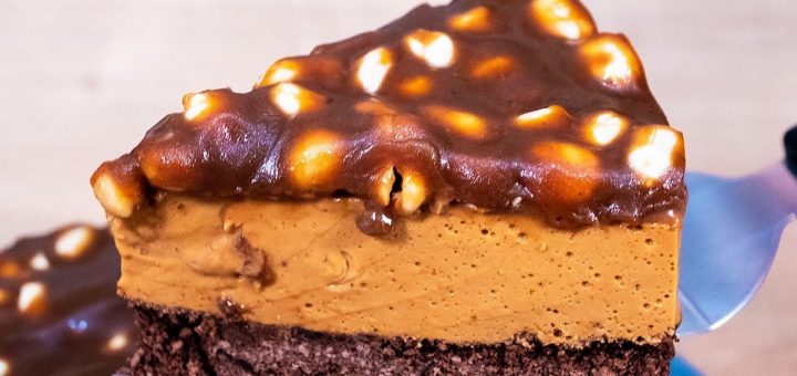 Такий смачний тортик Снікерс готуємо без випічки, але виходить він дуже повітряним і ніжним. Арахісовий тортик можна готувати і як святковий десерт – він дуже красиво виглядає. Інгредієнти: шоколадне печиво, крекери – 200 г...